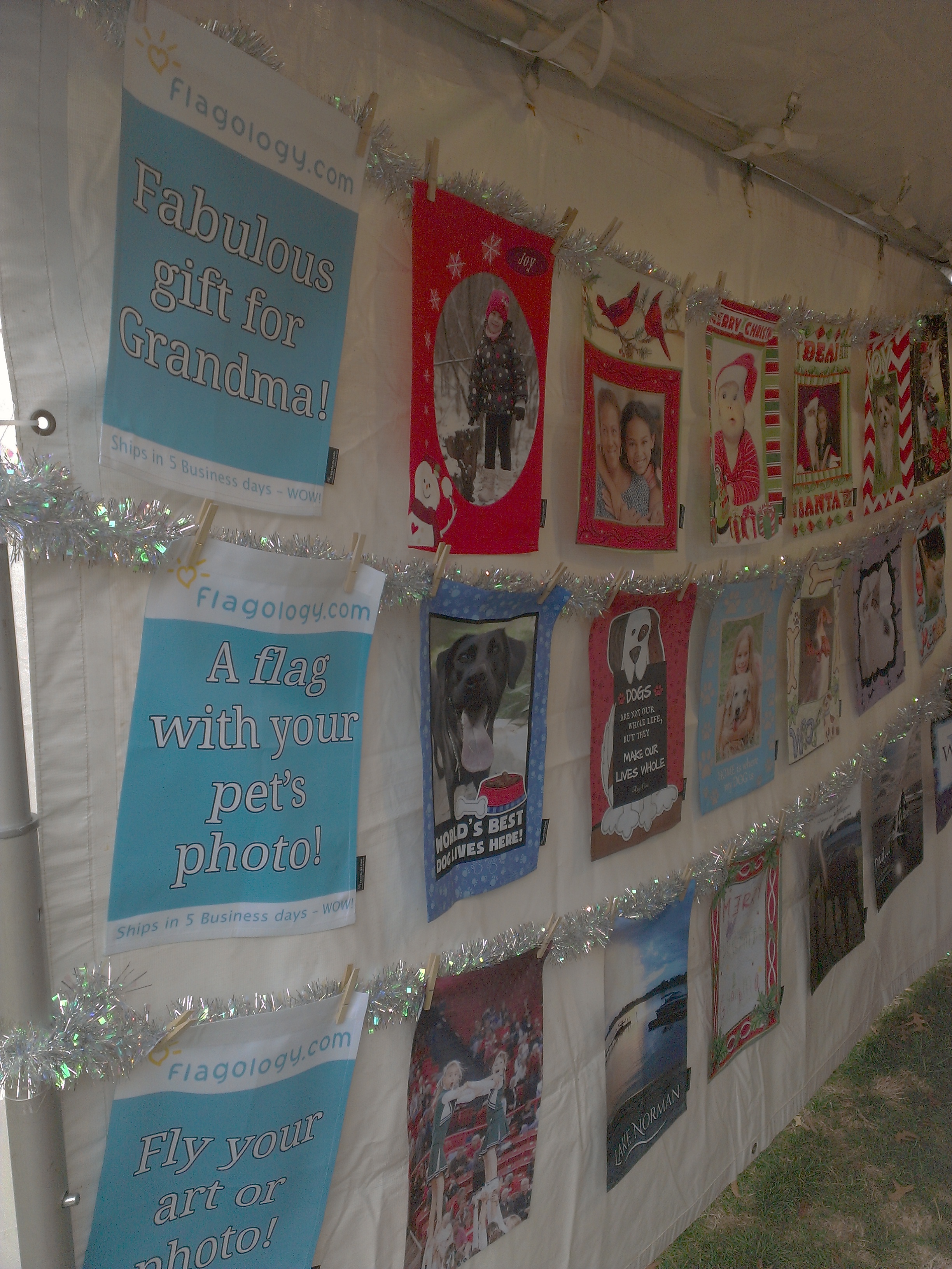 Beyond the excitement of the prize wheel, we were ecstatic to be able to meet so many people who were just as enthusiastic about our flags as we are! As you all know, we love showing off our dogs here at Flagology, and we quickly found out that the attendees of Christmas in Davidson did too! We saw tons of flag-worthy pooches both in person and excitedly shown to us in pictures on the phones of their proud owners. Besides pet flags, another big hit for many visitors to our booth was the wonderful idea of using a custom flag for a small business or non-profit organization! We loved being witness to the creative brainstorming sessions that many visitors had while looking at our tent and hearing all of their ideas for how they would customize their own flag.